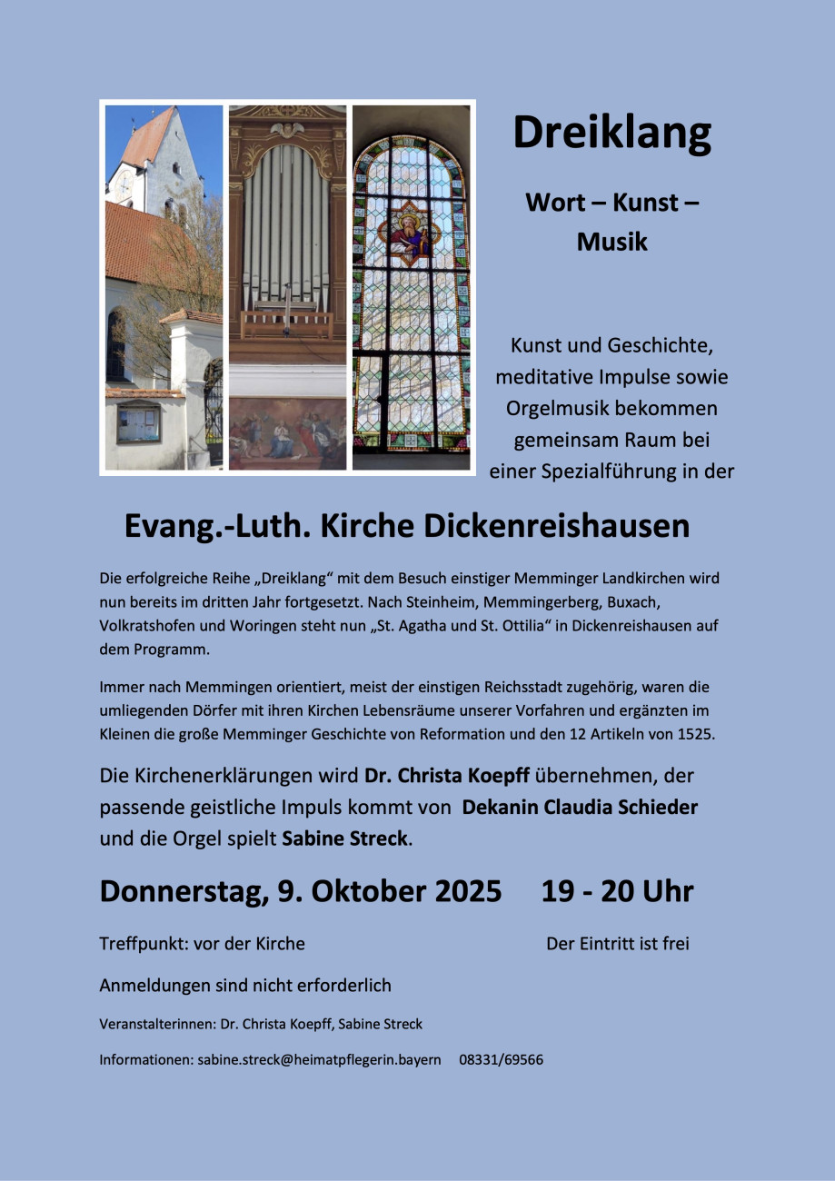 Dickenreishausen und Volkratshofen sind zwei evangelische Dörfer bei Memmingen, die gemeinsam eine Pfarrei bilden. Zur evangelischen Gemeinde Dickenreishausen gehören außerdem alle Evangelischen im Illerwinkel mit Legau, Lautrach, Kronburg und den dazu gehörenden Ortsteilen.